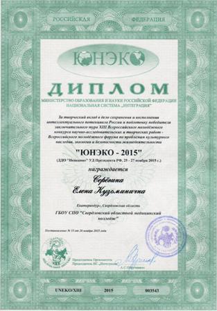 С 25 по 27 ноября 2015 г. в Москве проходил Всероссийский молодежный форум по проблемам культурного наследия, экологии и безопасности жизнедеятельности «ЮНЭКО-2015». В нем принял участие студент 4 курса специальности «Лечебное дело» ГБОУ СПО «Свердловский областной медицинский колледж» Еговцев Евгений как Лауреат заочного тура этого конкурса. Евгений представил работу «ДЕТСКИЙ ТРАВМАТИЗМ КАК МЕДИКО-СОЦИАЛЬНАЯ ПРОБЛЕМА», выполненную под руководством преподавателя колледжа, кандидата медицинских наук Серегиной Елены Кузьминичны. В своей работе Евгений опирается на результаты самостоятельно проведенного исследования и делает вывод о необходимости повысить грамотность молодых родителей в отношении профилактики детского травматизма, а также в отношении адекватности оказания первой медицинской помощи. Теоретические выводы автора уже апробированы в ходе акций для населения Екатеринбурга.