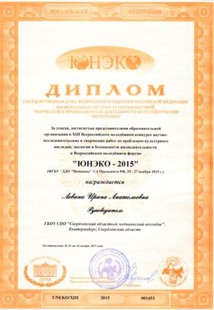 Ирина Анатольевна Левина, руководитель колледжа, награждена Дипломом «за успехи, достигнутые представителями образовательной организации в XIII Всероссийском молодежном конкурсе по проблемам культурного наследия, экологии и безопасности жизнедеятельности «ЮНЭКО».