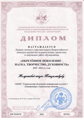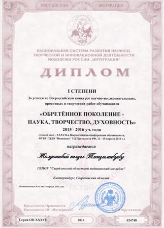 13-15 апреля 2016 г. в Москве прошел очный тур Всероссийского конкурса научно-исследовательских, проектных и творческих работ обучающихся «ОБРЕТЕННОЕ ПОКОЛЕНИЕ: НАУКА, ТВОРЧЕСТВО, ДУХОВНОСТЬ», учредителем и организатором которого является Общероссийская общественная организация «Национальная система развития научной, творческой и инновационной деятельности молодежи России «Интеграция» пи поддержке Государственной Думы Федерального Собрания Российской Федерации.