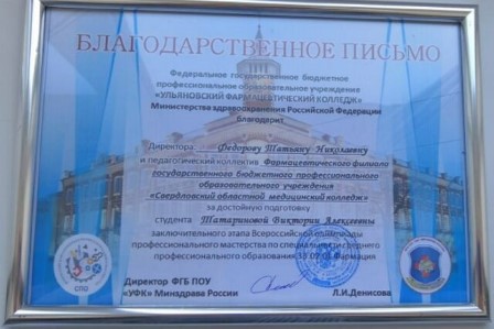 24-26 апреля 2019 г. прошел заключительный этап Всероссийской олимпиады профессионального мастерства по специальности среднего профессионального образования 33.02.01 Фармация в г. Ульяновск на базе ФГБПОУ «Ульяновский фармацевтический колледж» Министерства здравоохранения Российской Федерации.