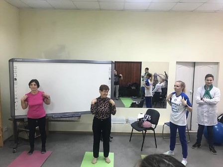 Во время практической части занятия студенты показали участникам Школы здоровья комплекс общеукрепляющих упражнений, которые можно выполнять дома самостоятельно.