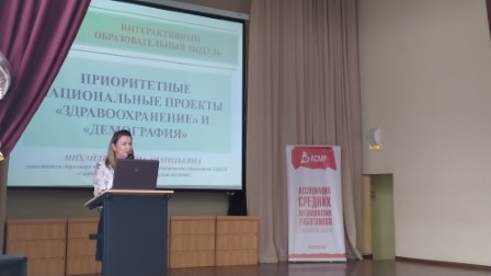 Специалистам был представлен интерактивный образовательный модуль «Приоритетные национальные проекты «Здравоохранение» и «Демография». В практической части участники семинара ответили на кейсовые задания модуля, закрепив полученные теоретические знания.