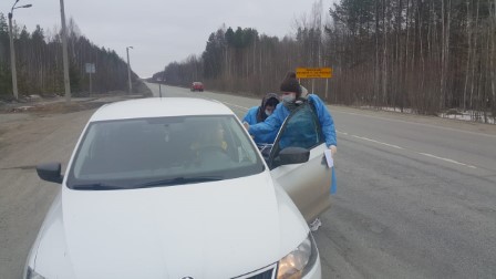 Волонтеры из Серовского филиала медицинского колледжа помогают дорожной полиции на трассе в рейде по профилактике распространения COVID 2019