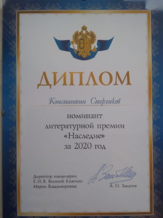 "Наследие 2020" Русский Императорский Дом". Преподаватель колледжа кафедры общеобразовательных дисциплин Свердловского областного медицинского колледжа Стерликов К.А. принял участие в Международном литературном конкурсе "Наследие", учрежденном Великой Княгиней Марией Владимировной Романовой. Произведения нашего преподавателя вышли в 1 томе альманаха "Наследие 2020" и были удостоены именного диплома.