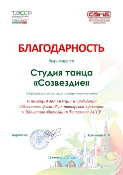 12 декабря участники студии танца «Созвездие» приняли участие в областном фестивале татарской культуры, посвященный 100-летию со дня образования Татарской АССР в Свердловской областной межнациональной библиотеке. Фестиваль проводился библиотекой совместно с Постоянным Представительством Республики Татарстан в Свердловской области, национально-культурными объединениями татар Свердловской области.