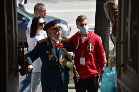 Добровольцы-спасатели, ВЦ СОМК, Волонтеры-медики, только что вернувшийся из Казани творческий коллектив «Надежда», который примкнул к коллегам, уже ведущим поздравление ветеранов.