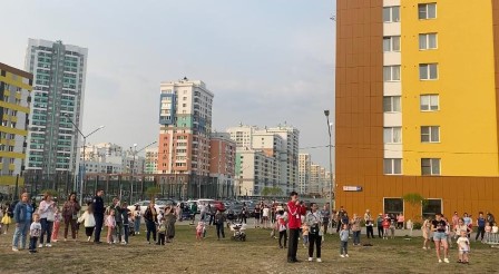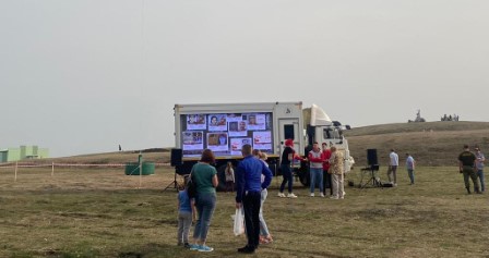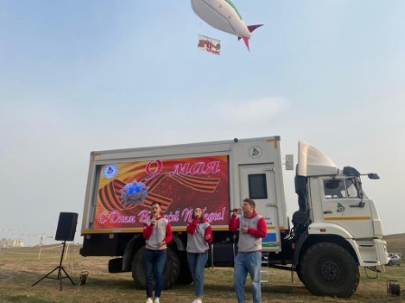 Акция с пением военных песен и прежде всего, песни «День Победы» во дворах с нашим мобильным комплексом с экраном на базе КАМАЗа.