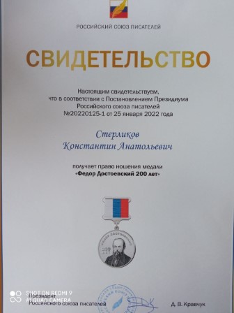 Прошедший 2021 год был объявлен в России годом Достоевского. Российский союз писателей, по итогам года, принял решение наградить Стерликова К.А. медалью «Федор Достоевский 200 лет» за вклад в развитие русской литературы и сохранение исторической памяти. Поздравляем Константина Анатольевича и желаем ему успеха в дальнейшей исследовательской и творческой деятельности!