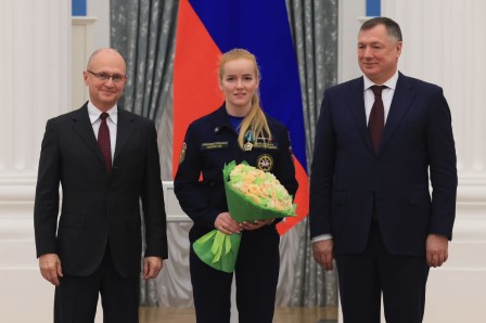В Екатерининском зале Кремлевского Дворца Евгению Леонидовну - добровольца Всероссийского студенческого корпуса спасателей, лидера Всероссийской акции взаимопомощи «МыВместе» - наградил Сергей Кириенко, первый заместитель Руководителя Администрации президента РФ.